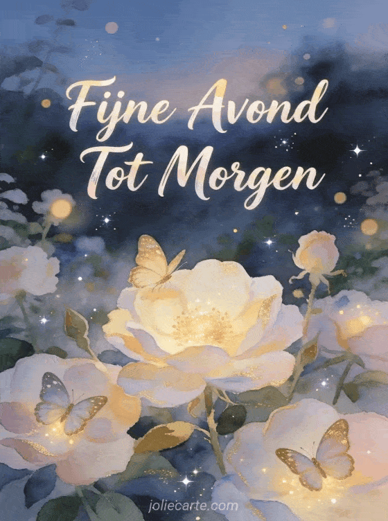 Stuur een dromerige fijne avond tot morgen afbeelding met een gloeiende bloemtuin bij schemering met vredige vlinders die neerslaan voor de nacht in zachte pastelkleuren en warme gouden tinten. Ontdek ook een fijne avond tot morgen humor kaart of een goede nacht tot morgen kusjes gif kaart of een fijne avond goede nacht tot morgen kaart.
