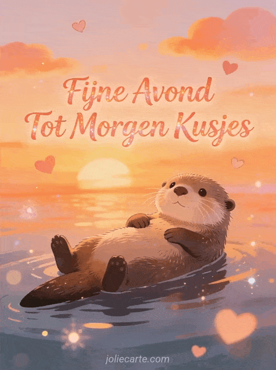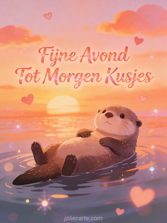 Stuur een schattige fijne avond tot morgen kusjes kaart met een adorable otter die op zijn rug drijft onder een zonsonderganghemel met zachte wolken en drijvende hartjes in een liefdevolle avondsfeer. Ontdek ook een afbeelding fijne avond en tot morgen kaart of een afbeelding fijne avond tot morgen kaart of een mooie avond tot morgen kaart.