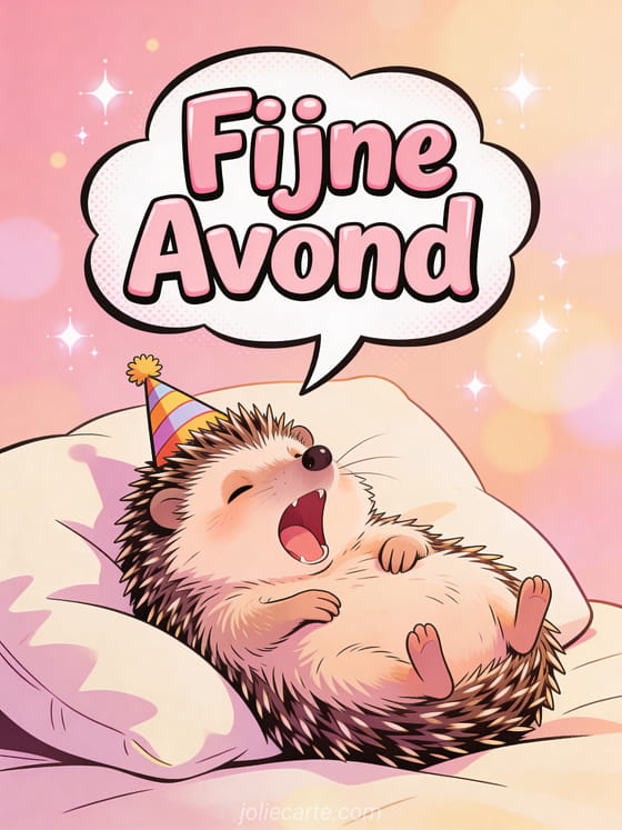 Stuur een grappige fijne avond vriendinnen humor groet via deze gratis wenskaart. Een schattige egel met een klein feesthoedje die gaapend zit op een zacht kussen, een vrolijke vriendschappelijke sfeer met warme roze en beige tinten. Bekijk ook een tekst om fijne avond te wensen of een fijne avond kusjes van mij.