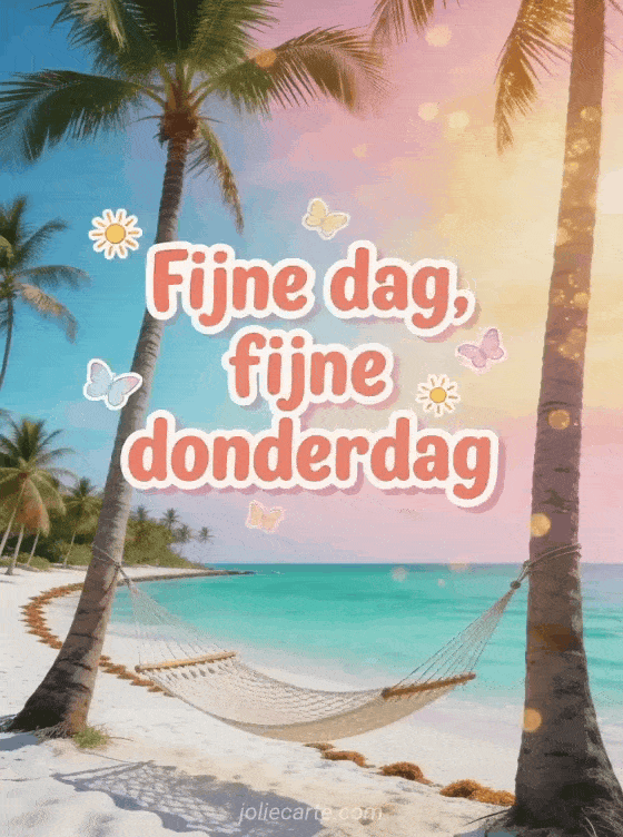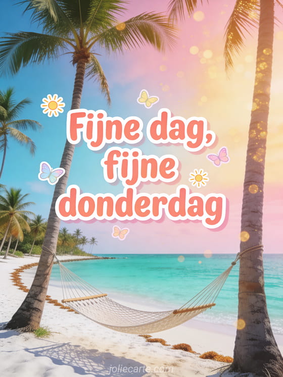 Verstuur een fijne dag donderdag kaart met ronde koraalroze letters, kleine zonnetjes, pastelvlinders en een wit zandstrand met palmbomen. Deel een warme wens voor doordeweeks en ontdek ook fijne donderdag bericht, fijne donderdag vriendin of fijne donderdag positieve quote.
