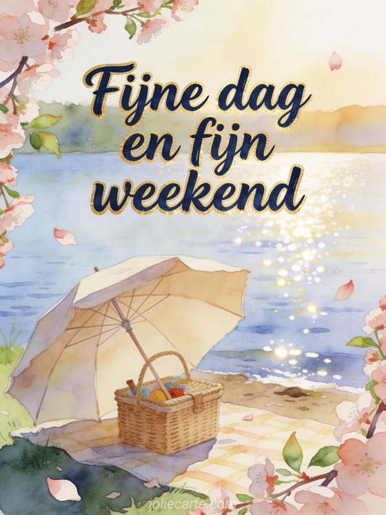 Deel een ontspannen groet voor een fijne dag en een fijn weekend met een picknick aan het meer, een canvas parasol, een picknickmand en kersenbloesemtakken in aquarel. Ontdek ook goedemorgen fijne dag kusjes gif, fijne dag natuur gif of goedemorgen en fijne dag gifs.