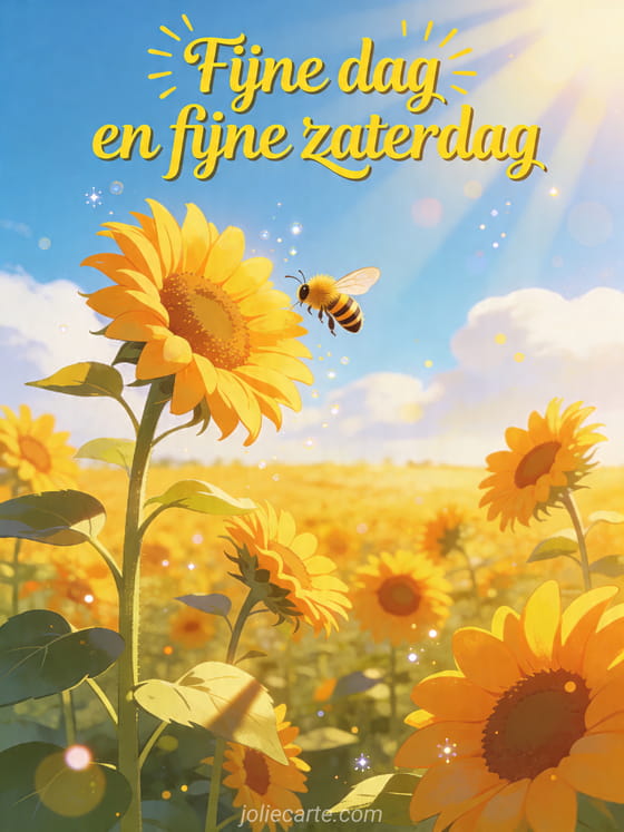 Stuur een vrolijke zaterdaggroet met deze heldere kaart van een zonnebloemveld onder een blauwe lucht met een bij die ernaast zweeft. Ontdek ook gratis fijne zaterdag kusjes afbeelding, citaat fijne zaterdag of fijne zaterdag afbeelding gratis.