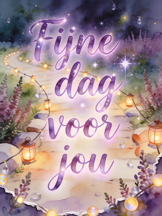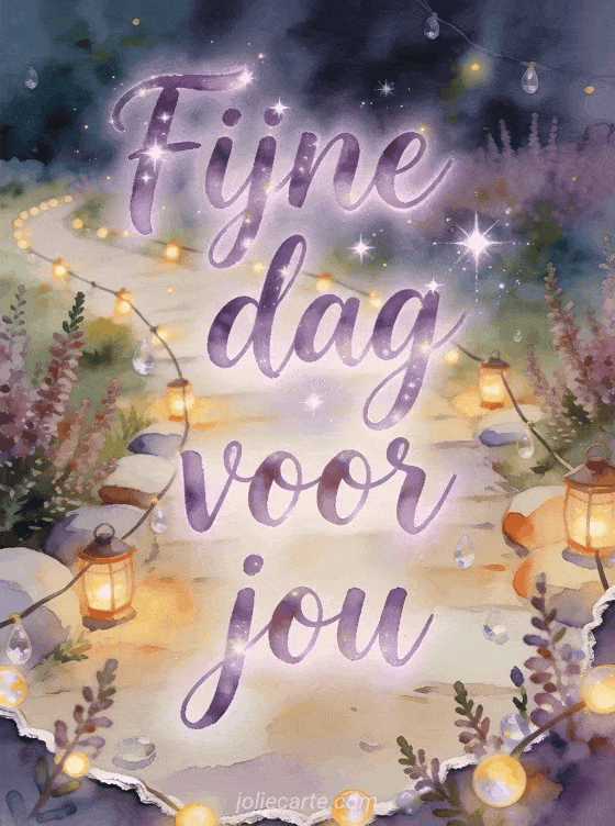 Stuur fijne dag fee gif met violette aquarelletters, een tuinpad met lichtslingers, kleine gloeiende lantaarns, kristaldruppels en heidetakjes over de rand. Misschien vind je ook deze fijne dag kusjes geanimeerde gif, deze koffie fijne dag koffie gif of deze fijne dag kitten gif mooi.