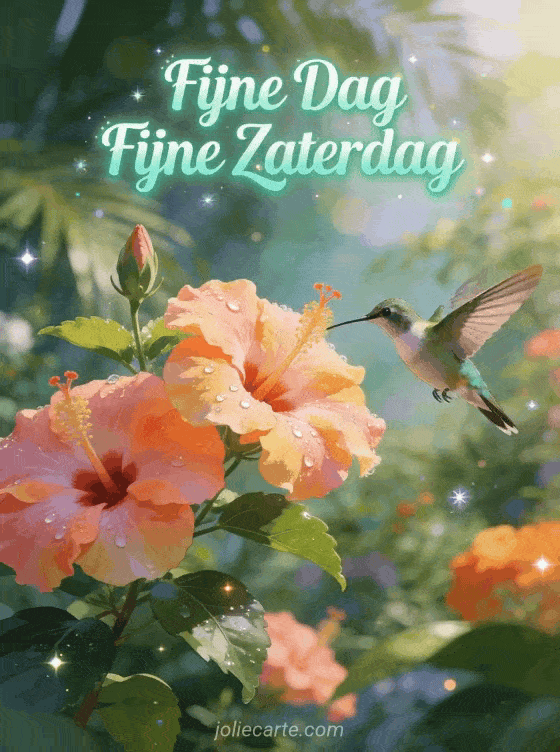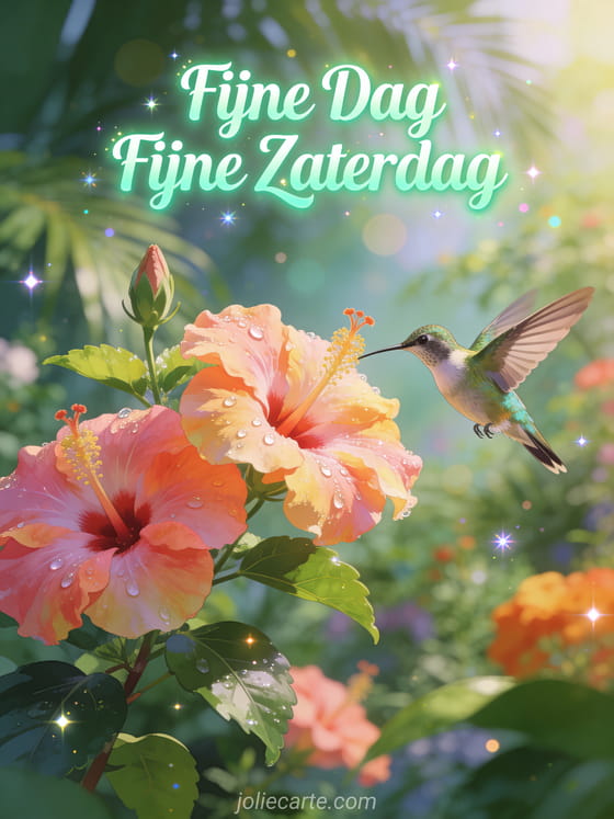 Stuur een stralende zaterdag- en daggroet met een prachtige kolibrie die zweeft bij hibiscusbloemen in een tropische tuin. Bekijk ook een fijne zaterdag in de regen humor of een fijne zaterdag hartje.