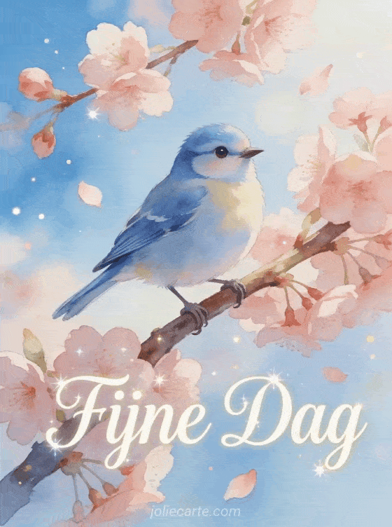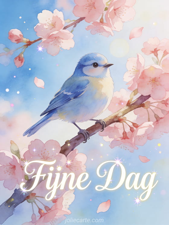 Stuur een lenteachtige fijne daggroet met een vrolijk blauw vogeltje op een bloeiende kersenbloesemtak met zacht roze bloemblaadjes in de bries. Bekijk ook een goedemorgen en fijne dag of een fijne dag.