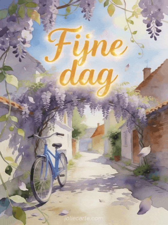 Wens een fijne dag met een charmant dorpsstraatje, blauwe regen boven een blauwe fiets en frisse aquarelkleuren. Je kunt ook fijne dag foto's gif, fijne dag kusjes geanimeerde gifs of een fijne zonnige dag gif sturen.