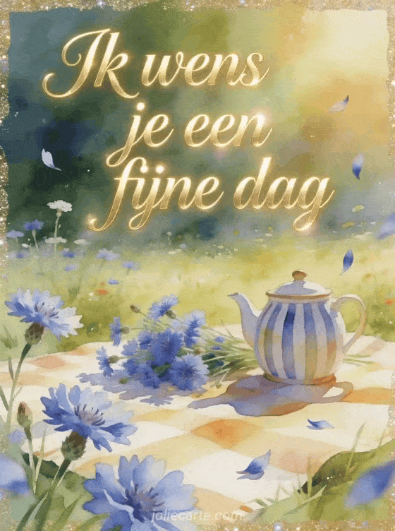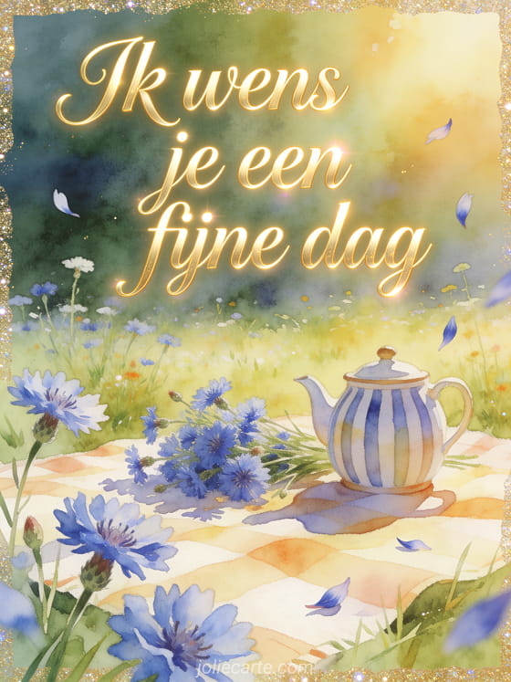 Deel fijne dag gifs met sierlijke gouden letters, een picknickstilleven in de weide, korenbloemen en een gestreepte theepot in ochtendlicht. Je kunt ook een fijne regenachtige dag gif, een kaart met fijne regenachtige dag of kusjes fijne dag gif sturen.