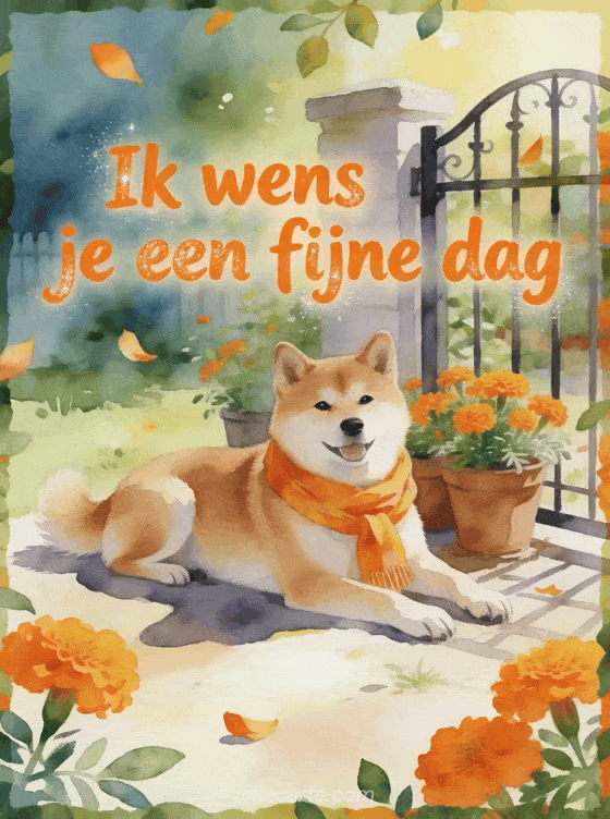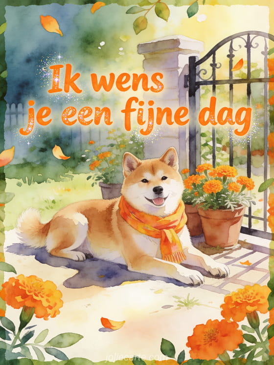 Maak iemands dag lichter met een aquarel akita inu hond bij een tuinhek, potten met goudsbloemen, een heldere sjaal en zachte ochtendzon. Ontdek ook fijne dag hart gifs, fijne dag teksten of elfjes fijne dag gifs.