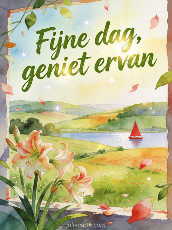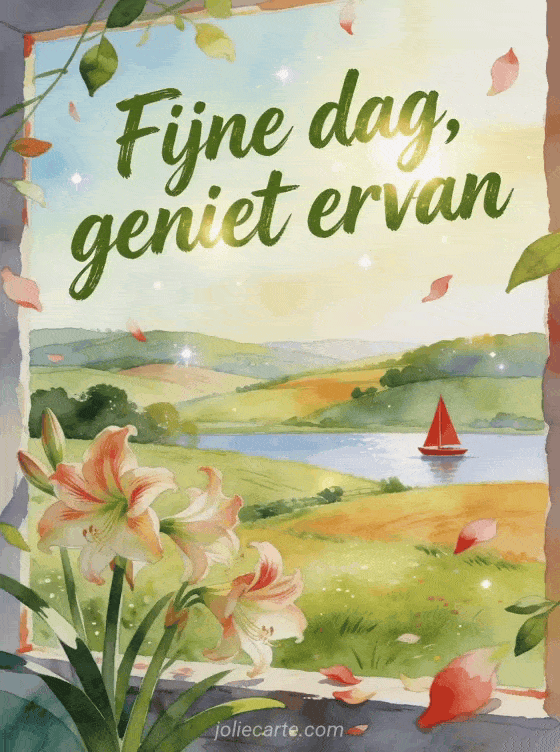 Stuur fijne dag landschap gif met mosgroene letters, een glooiend plattelandslandschap, amaryllis in de voorgrond en een rode zeilboot op een ver meer. Misschien vind je ook deze fijne dag goedemorgen fijne dag gif, deze goedemorgen gif goedemorgen fijne dag of deze fijne dag regen gif mooi.