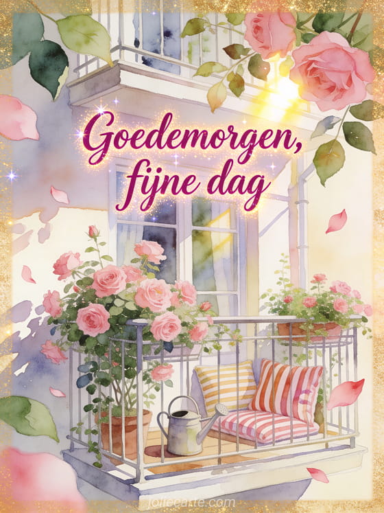 Deel een heldere kaart voor goedemorgen en fijne dag met roze rozen, een kleine gieter, gestreepte kussens en warm zonlicht op een balkontuin. Bekijk ook goedemorgen fijne dag geanimeerde afbeelding, goedemorgen fijne dag kusjes afbeeldingen of fijne dag geanimeerde gif goedemorgen fijne dag.