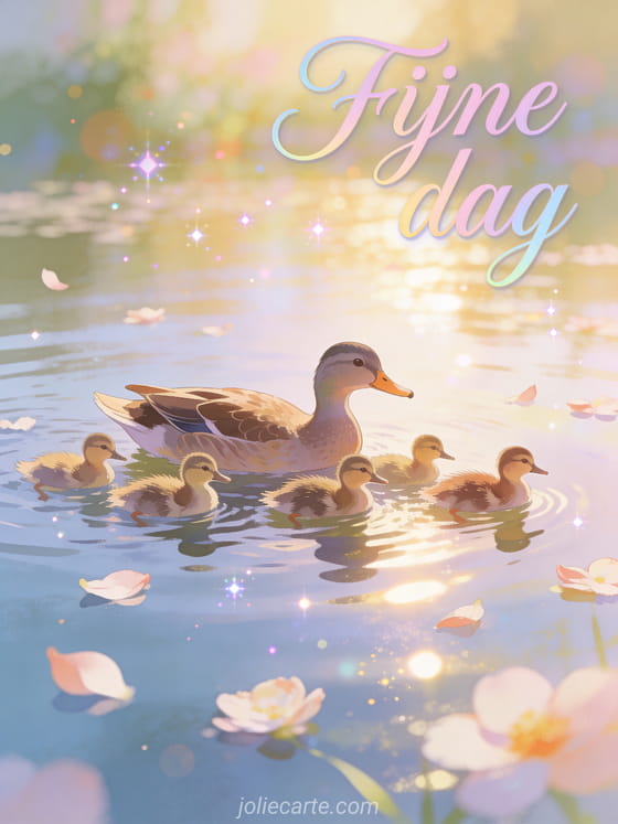 Deel fijne dag op donderdag met een mama-eend die haar eendjes over een zonovergoten vijver met drijvende bloemblaadjes leidt. Stuur meer vriendelijke wensen met fijne donderdag kusjes afbeelding, goedemorgen het is donderdag afbeelding of fijne donderdag fijne dag.