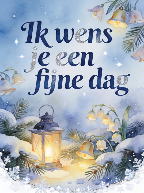 Wens iemand een fijne dag met een gezellige wintertuin, een gloeiende lantaarn, zachte sneeuw, dennentakken en klokjesbloemen in heldere aquarelwarmte. Deel deze sprankelende kaart en ontdek ook fijne dag afbeelding met kusjes, fijne dag zon gif of fijne dag landschap gif.