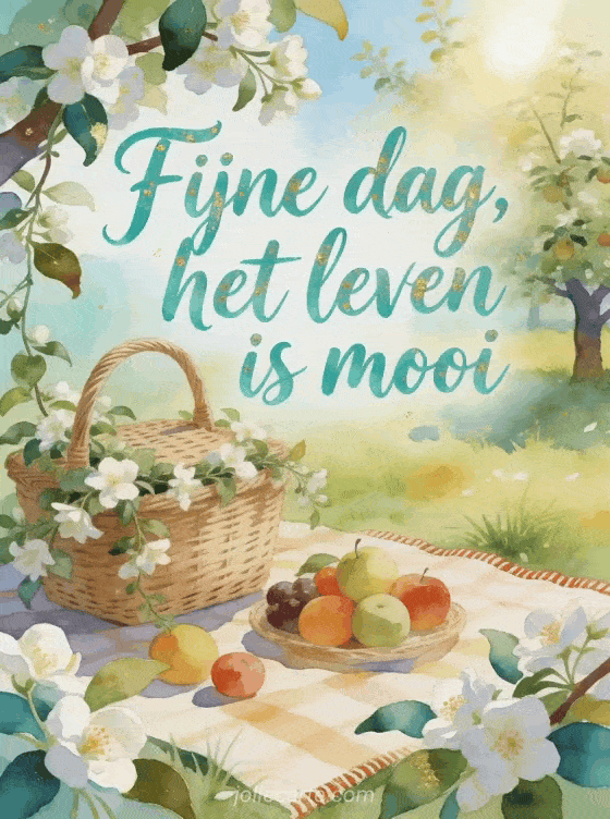 Stuur een heldere fijne dag-boodschap met turquoise letters, een hoekje in de boomgaard, een picknickmand, jasmijnranken, vers fruit en zonovergoten gras. Ontdek ook elfjes fijne dag gifs, fijne dag kat gifs of goedemorgen en fijne dag afbeeldingen.
