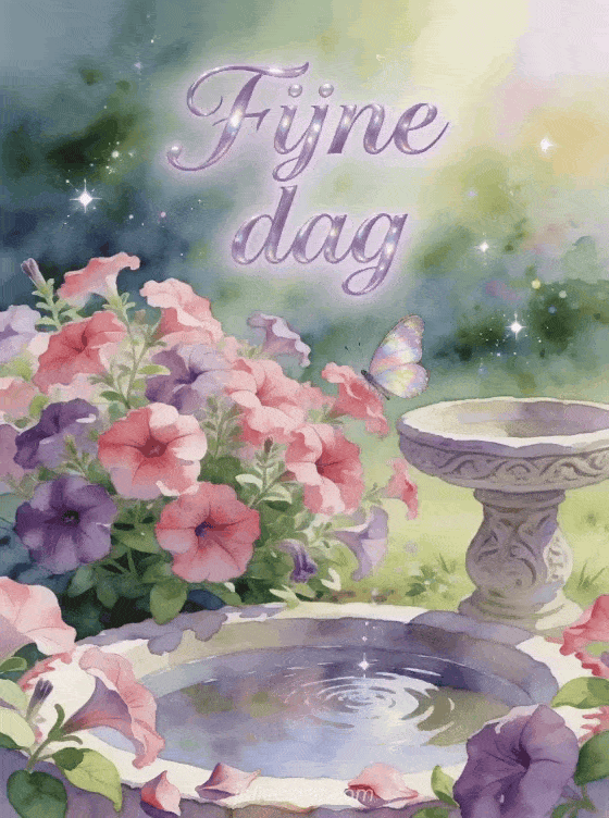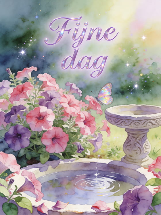 Stuur een tedere fijne dag-groet met lavendelkleurige letters, een petuniatuin, een kleine vlinder, een gebeeldhouwd vogelbad en ochtendlicht. Ontdek ook een fijne dag kat gif, fijne dag gifs of een fijne regenachtige dag gif.