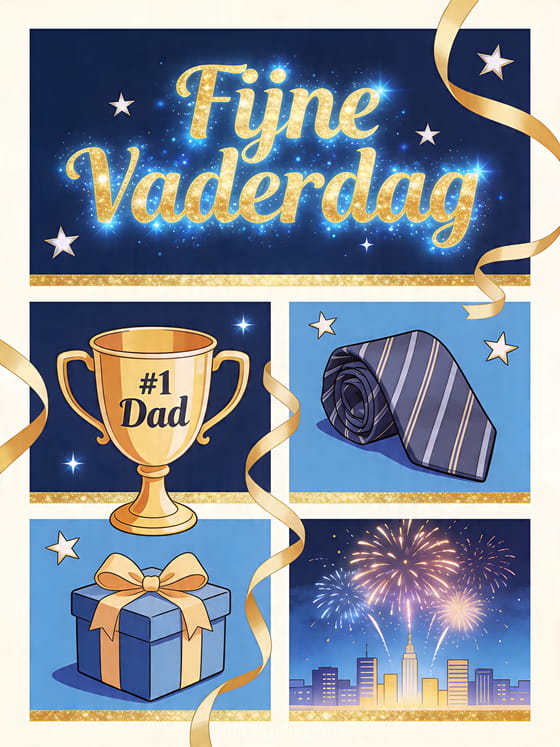 Vier papa met een levendige geïllustreerde Vaderdagkaart met een trofeekopje, gevouwen stropdas, cadeau en heldere stad onder vuurwerk. Dit feestelijke ontwerp brengt energie en vreugde in de dag. Bekijk ook een vaderdagkaart stropdas, fijne Vaderdag papa kaart of lieve woorden vaderdag.