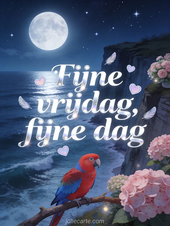 Verstuur een fijne dag vrijdag kaart met elegante witte letters, zilveren glans, pastelhartjes en een kustklif in maanlicht boven de zee. Deel een poëtische wens voor het einde van de week en ontdek ook fijne vrijdag zen citaat, fijne vrijdag en fijn weekend of fijne vrijdag kusjes afbeelding.