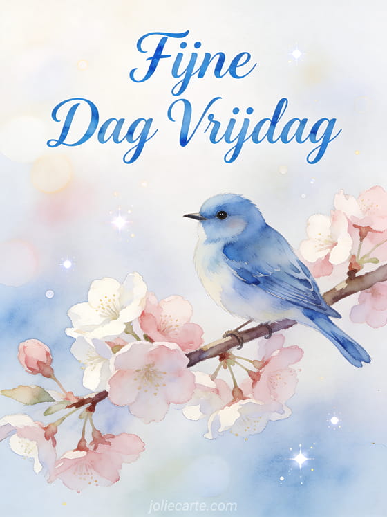 Stuur een charmante fijne dag vrijdag wens met een blauwe vogel gezeten op een bloeiende kersenboomtak in een verse lentemorgen. Ontdek ook een zen fijne vrijdag kaart of een gif vrijdag humor kaart.