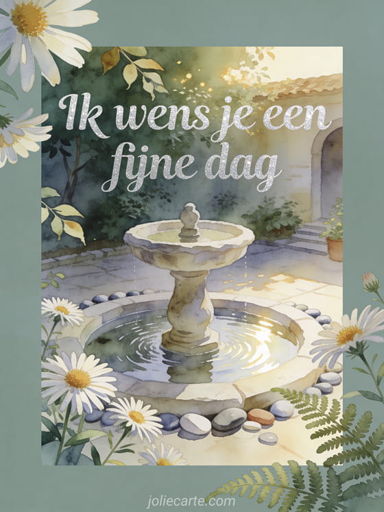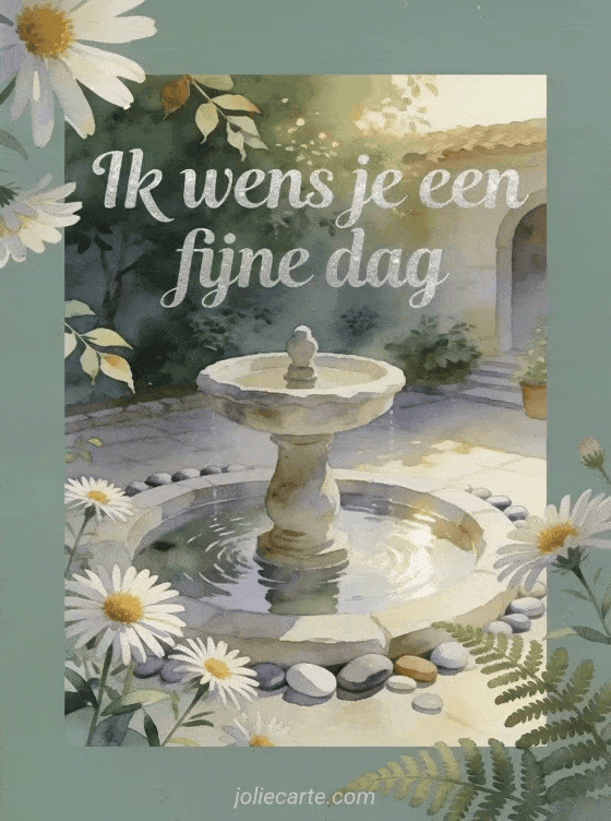 Wens een fijne dag met een rustige stenen fontein, een groene binnenplaats, asterbloemen, gladde kiezels en kabbelend water. Ontdek ook een fijne dag hond gif, fijne dag hart gifs of fijne dag teksten.