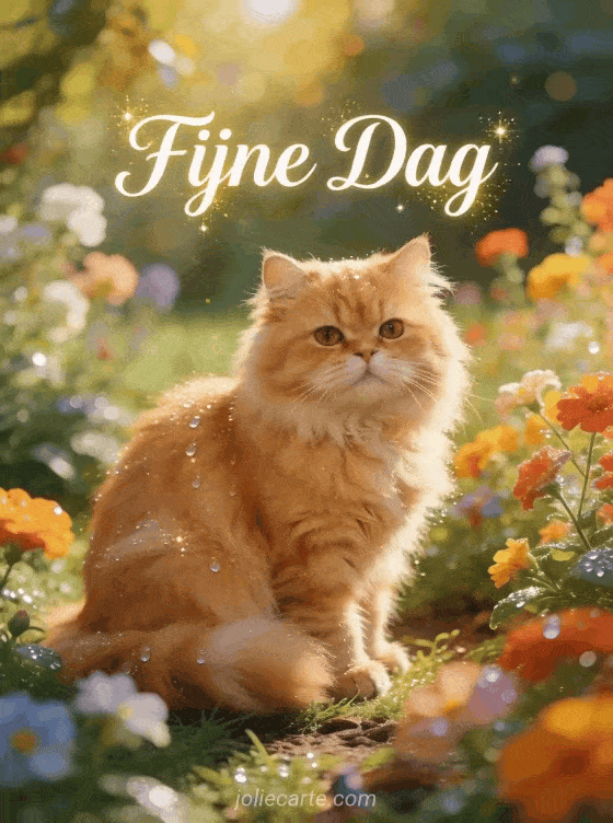 Stuur een mooie fijne daggroet met een pluizige gember Perzische kat in een zonnige tuin met dauw op kleurrijke bloemen in zacht gouden licht.