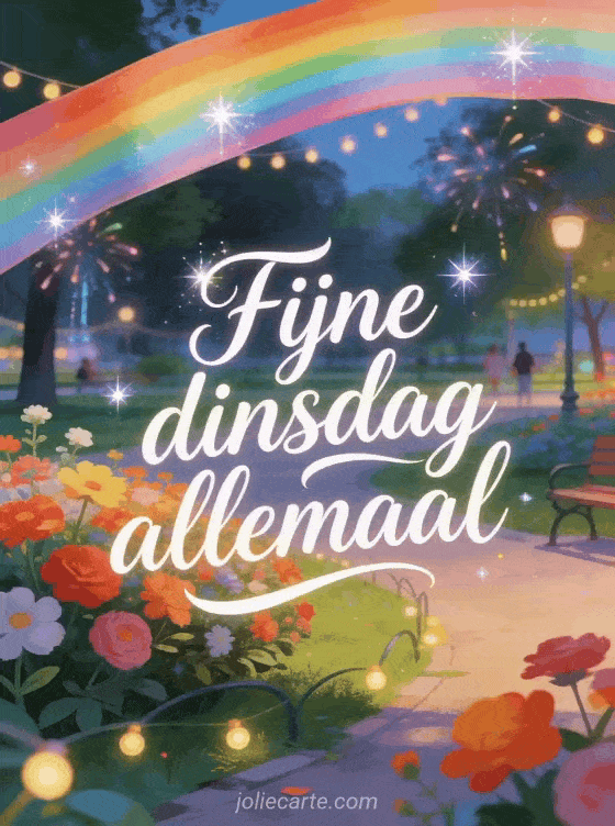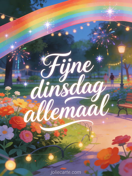 Deel fijne dinsdag allemaal met vloeiende kalligrafie, een regenboogbanner boven een vrolijke parkscène, heldere bloemen en feestelijke lichtjes. Stuur ook fijne dinsdag dieren gif, mooie geanimeerde fijne dinsdag afbeeldingen of een fijne dinsdag regen afbeelding.