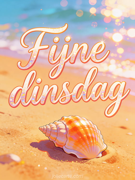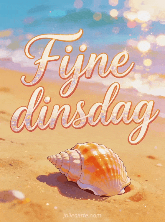 Deel fijne dinsdag Facebook afbeeldingen met levendige kalligrafie, een heldere schelp op warm zand en glinsterende zeereflecties. Stuur ook een fijne dinsdag in de regen afbeelding, fijne dinsdag gifs of een fijne dinsdag in de regen gif.