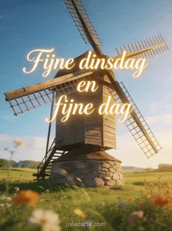 Deel een groet voor fijne dinsdag en fijne dag met elegante gouden letters, een molen in een licht landschap, een heldere blauwe hemel en warm filmisch licht. Ontdek ook fijne dinsdag kusjes gifs, fijne dinsdag hond gif of fijne dinsdag geanimeerde afbeelding.