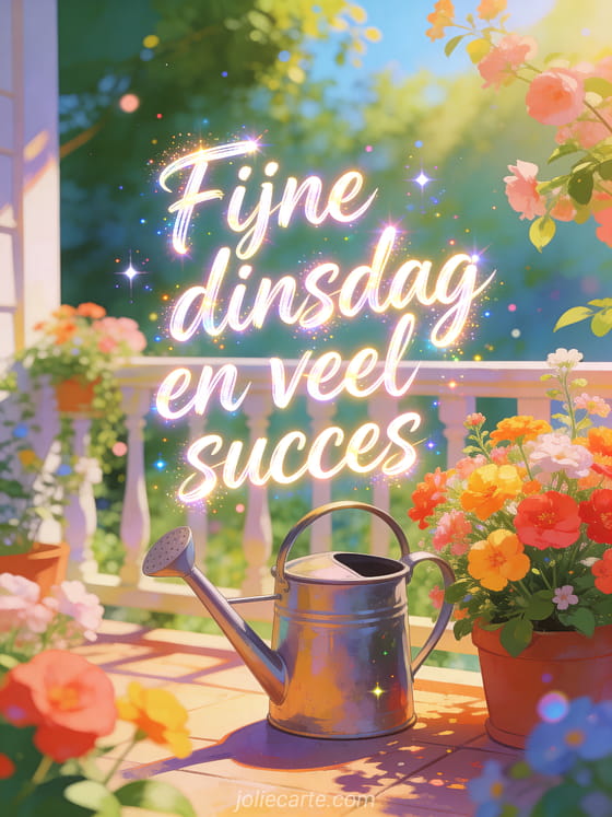 Deel gratis afbeeldingen voor fijne dinsdag met levendige penseelletters, een klassieke gieter naast heldere bloemen op een zonnig terras en glinsterende lichtdeeltjes. Stuur ook fijne dinsdag virtuele kaarten, een fijne dinsdag gif of een dinsdag kusjes gif.