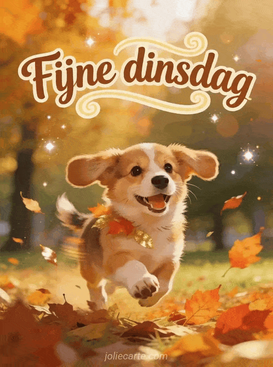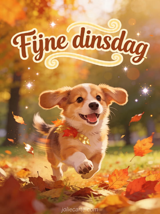 fijne dinsdag een speelse dinsdaggroet vol herfstbladeren en puppy-energie