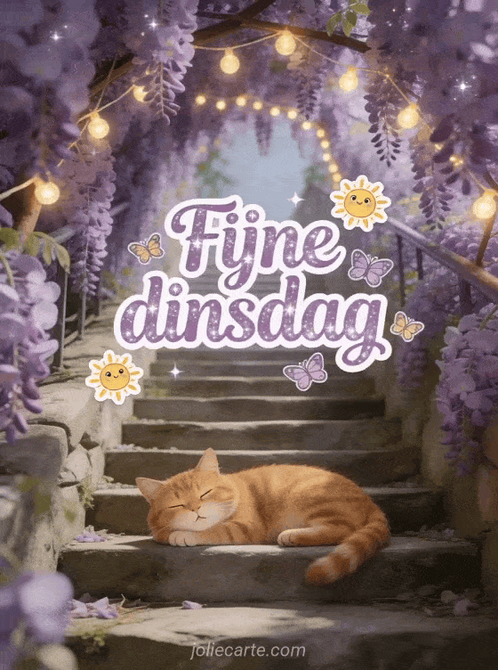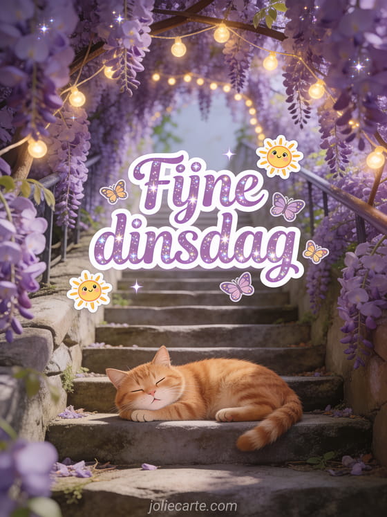 Stuur een grappige kaart voor fijne dinsdag met speelse paarse letters, kleine zonnen, ondeugende vlinders en stenen trappen bedekt met afhangende mauve blauwe regen, geblokkeerd door een gelukzalig slapende rode kat. Ontdek ook fijne dinsdag virtuele kaart, goedemorgen fijne dinsdag afbeelding of fijne dinsdag kaart.