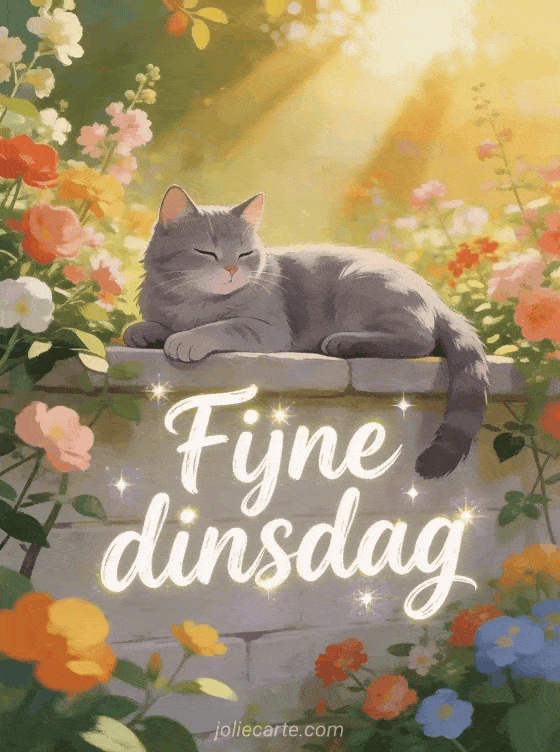 Stuur een warme dinsdaggroet met speelse penseelletters, fonkelende accenten, een grijze kat op een heldere tuinmuur, levendige bloemen en gouden ochtendstralen. Bekijk ook deze fijne dinsdag landschap afbeelding, deze fijne dinsdag dag gif of deze fijne dinsdag kusjes gratis afbeeldingen.