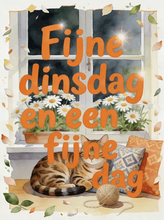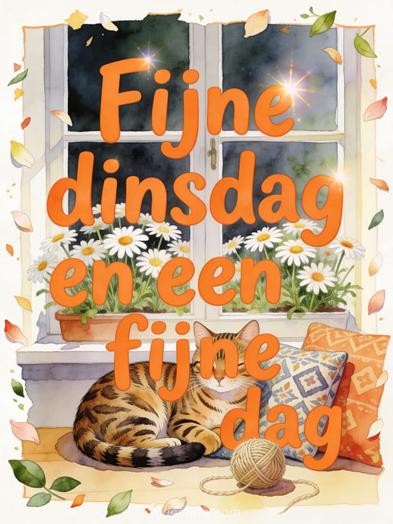 Deel een gezellige fijne dinsdag boodschap met een Bengaalse kat bij een raam met margrieten, een bol wol en kussens met patroon. Stuur ook een goedemorgen fijne dinsdag gif, fijne dinsdag kaarten of een fijne dinsdag glinsterende afbeelding.