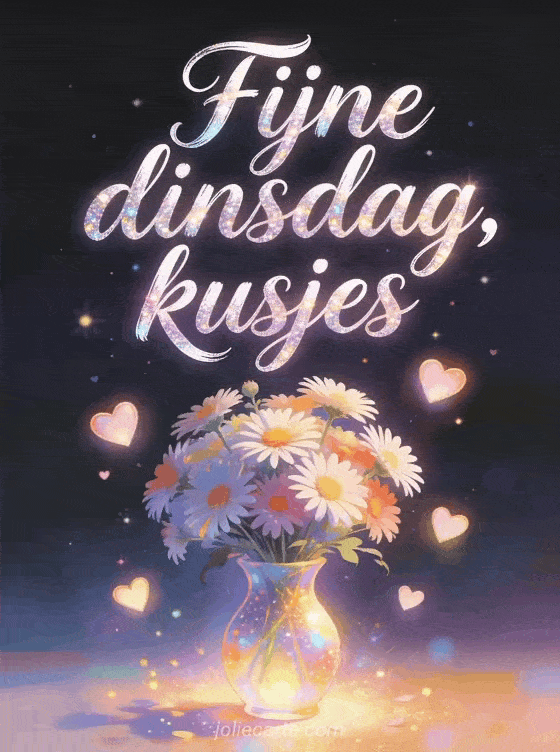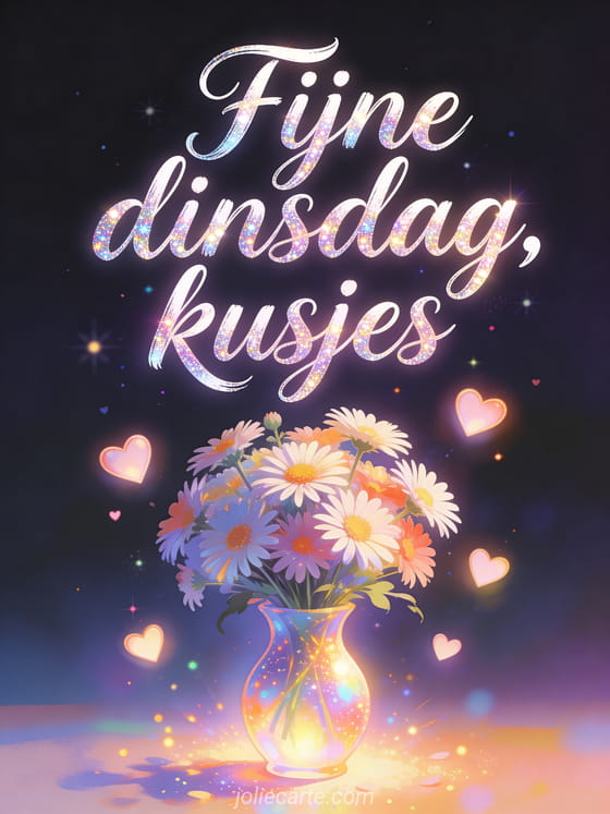 Deel fijne dinsdag met kusjes in een kaart met glinsterende penseeltekst, een kleurrijk asterboeket in een stralende vaas, zwevende hartlichten en zachte sprankels. Ontdek ook fijne dinsdag fijne dag gif, fijne dinsdag gif of goedemorgen en fijne dinsdag bericht.