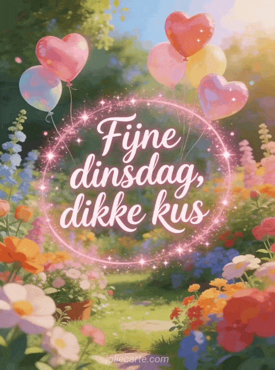 Stuur een tedere dinsdaggroet met ronde roze glinsterende kalligrafie, hartballonnen boven een heldere kleurrijke tuin, warme gloed en lichte glitter. Bekijk ook deze fijne dinsdag kusjes afbeelding, deze fijne dinsdag humor afbeelding of deze fijne dinsdag virtuele kaart.