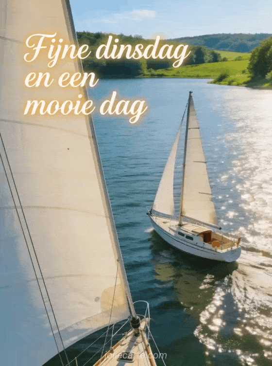 Stuur een warme dinsdaggroet met elegante gloeiende letters, een zeilboot op een glinsterend meer onder een heldere lucht, groene oevers en natuurlijk realistisch licht. Bekijk ook deze fijne dinsdag dag gif, deze fijne dinsdag kusjes gratis afbeeldingen of deze fijne dinsdag kusjes afbeelding.