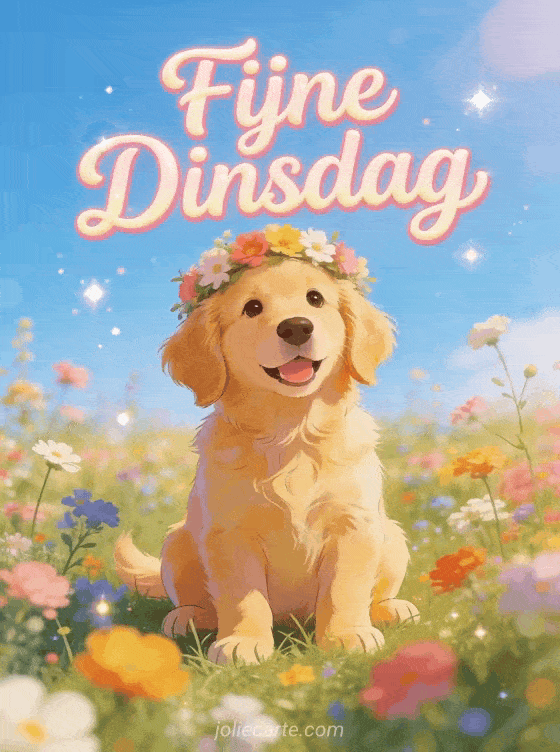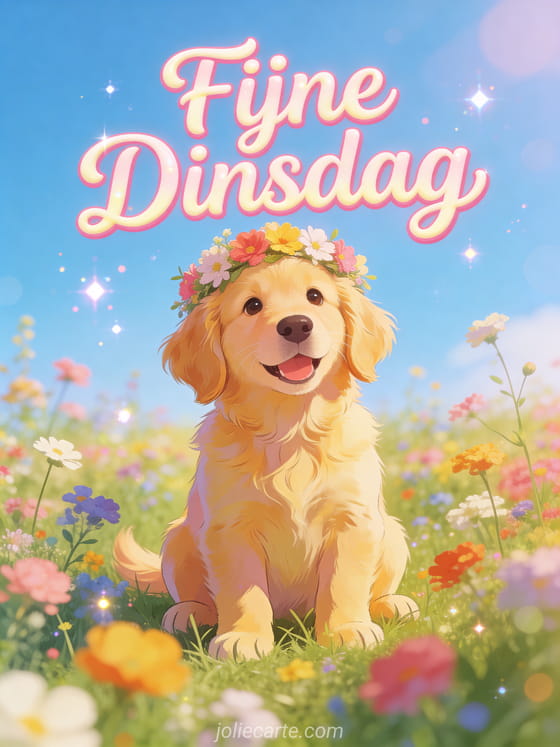 Stuur een vrolijke fijne dinsdag groet om te delen op Facebook via deze gratis wenskaart. Een blije golden retriever puppy met een bloemenkrans in een veld met kleurrijke wilde bloemen op een zonnige dag, perfect om te delen. Bekijk ook een fijne dinsdag aan jullie allemaal.