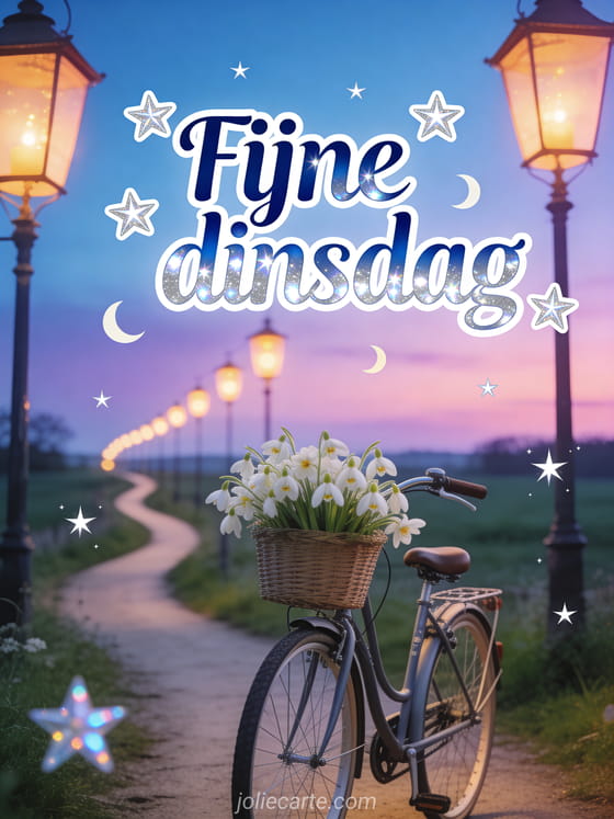 Stuur een romantische kaart voor fijne dinsdag met nachtblauwe letters, zilveren accenten, fonkelende sterren, kleine manen en een vintage fiets met een mand vol witte madeliefjes op een kronkelend landweggetje in het blauwe uur. Ontdek ook goedemorgen fijne dinsdag afbeelding, fijne dinsdag kaart of grappige fijne dinsdag humor afbeelding.