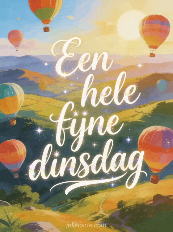 Deel een virtuele kaart voor fijne dinsdag met geschilderde kalligrafie, kleurrijke luchtballonnen boven een zonnige vallei en zachte heuvels. Stuur ook fijne dinsdag gif, dinsdag kusjes gif of fijne dinsdag gratis afbeelding.