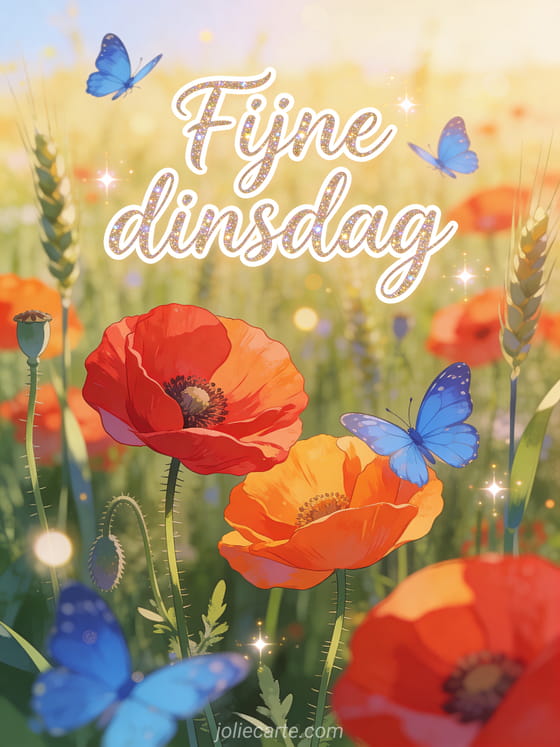 Deel fijne dinsdag met glinsterende kalligrafie, een heldere klaprozenweide en blauwe vlinders boven de bloemen. Stuur ook fijne dinsdag gratis afbeeldingen, fijne dinsdag virtuele kaarten of fijne dinsdag gif.