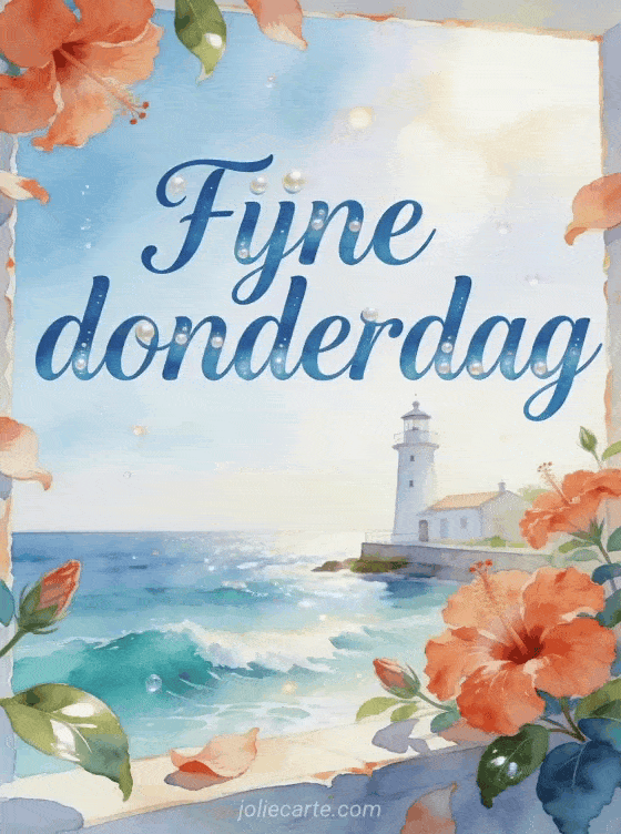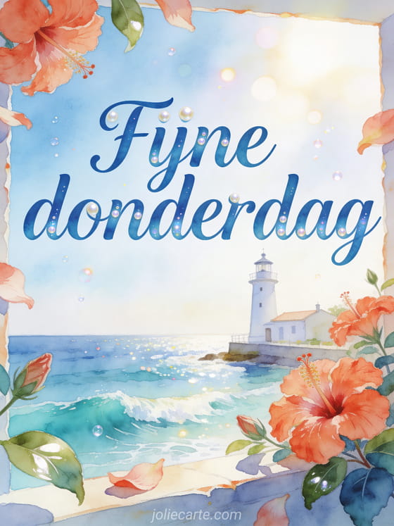 Stuur fijne donderdag met oceaanblauwe letters, een lichte plek aan zee, een witte vuurtoren, koraalkleurige hibiscusbloemen en turquoise golven. Ontdek ook fijne donderdag sprankelende afbeelding, goedemorgen fijne donderdag geanimeerde gif of fijne donderdag gifs.