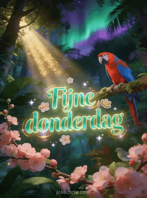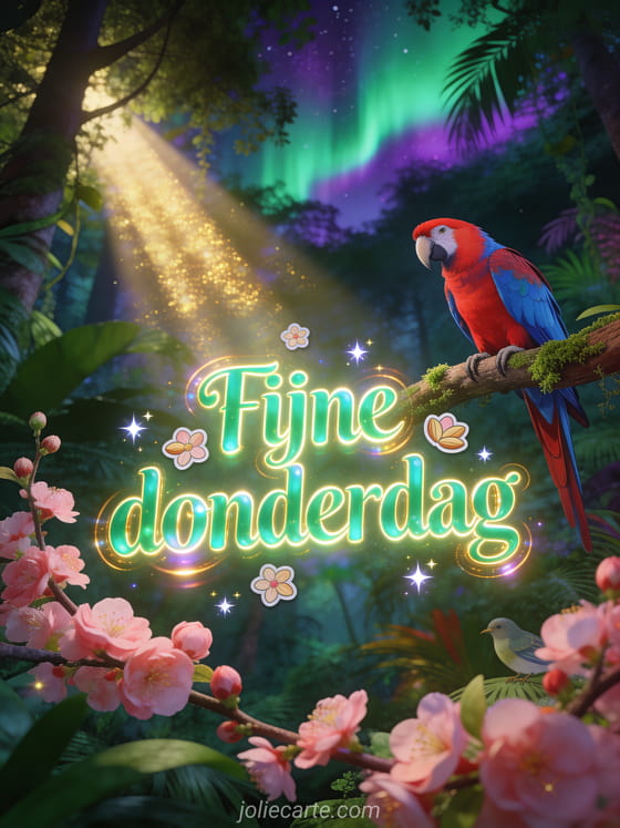 Stuur een fijne donderdagkaart met smaragdgroene letters, amandelbloesem, fonkelende sterren en een rode en blauwe ara in een tropisch bos onder groen en violet noorderlicht. Ontdek ook positieve gedachte positieve fijne donderdag citaat, fijne donderdag afbeeldingen met rozen of fijne dag op donderdag afbeeldingen.
