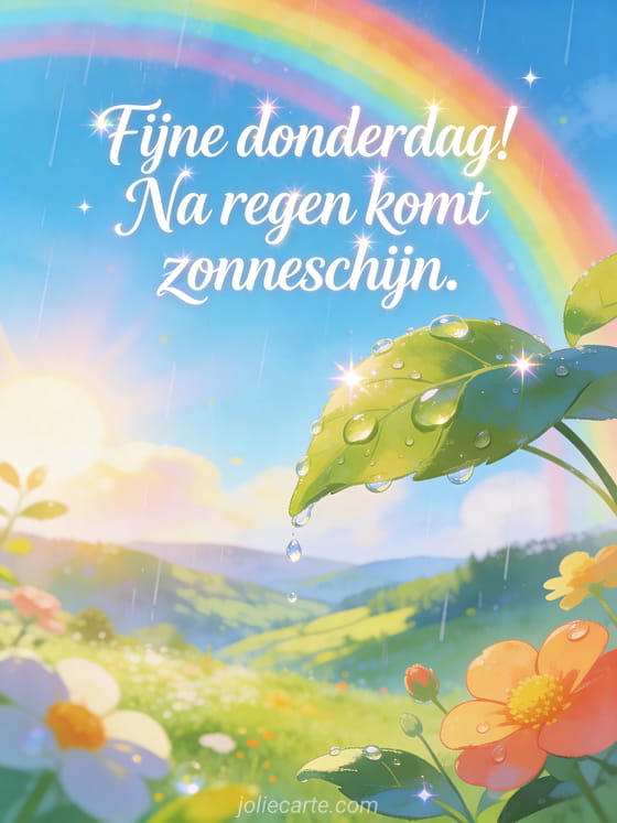 Deel een positief fijne donderdag bericht met elegante kalligrafie, een stralende regenboog boven een zonnige vallei na de regen, glinsterende druppels en vrolijke kleuren. Bekijk ook fijne donderdag vriendin, fijne donderdag positieve quote of afbeeldingen van fijne donderdag.