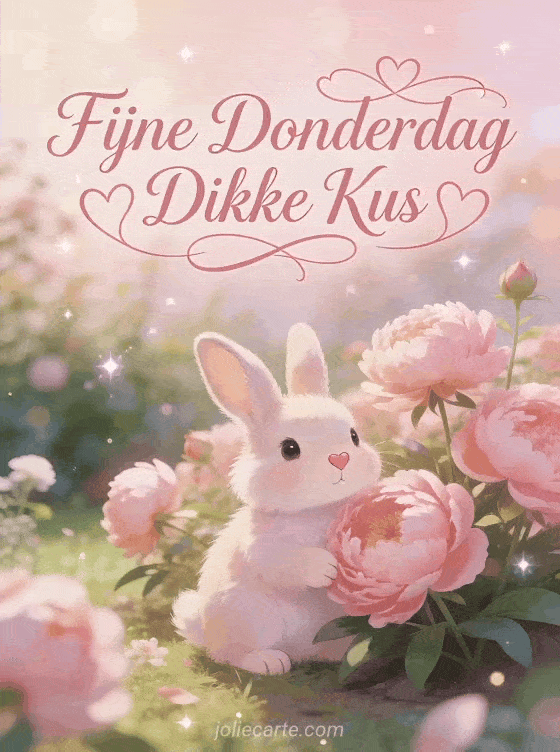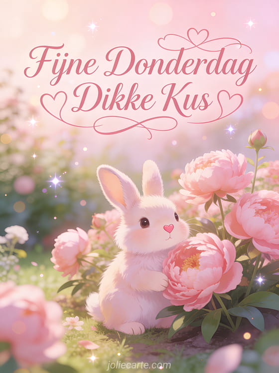 Stuur een liefdevolle donderdaggroet met een schattig pluizig konijn omringd door roze pioenrozen in een romantische tuin. Bekijk ook een bericht fijne donderdag of een ik wens je een fijne donderdag.