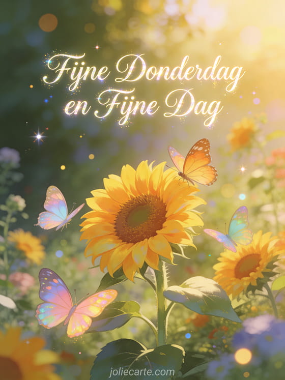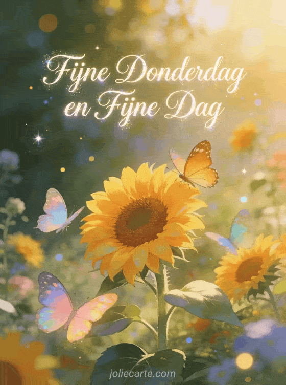 Stuur een kleurrijke fijne donderdag en fijne dag wens met vlinders dansend om zonnebloemen. Ontdek ook een fijne glinsterende donderdag kaart of een goedemorgen regenachtige donderdag kaart.