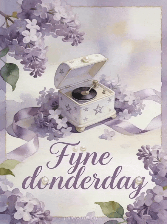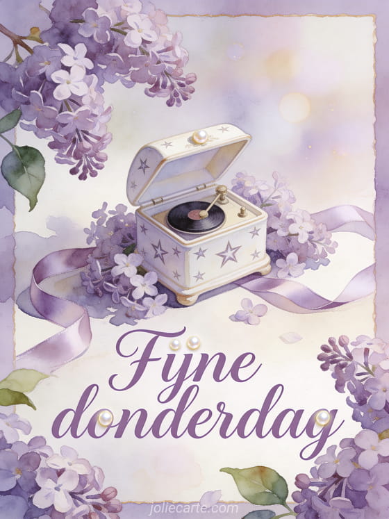 Wens een fijne donderdag met een porseleinen muziekdoos, sterpatronen, seringen en satijnen linten in zacht pastel aquarellicht. Je kunt ook fijne donderdag regen, goedemorgen fijne donderdag en fijne dag of fijne donderdag bloemen afbeeldingen sturen.