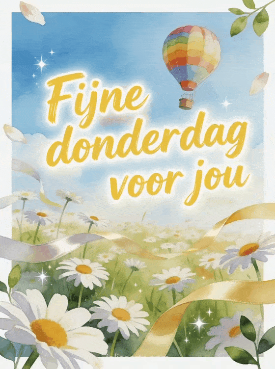 Stuur fijne donderdag voor jou met stralende gele letters, een kleurrijke luchtballon, margrieten en linten boven een lichte weide. Ontdek ook fijne donderdag hartjes afbeeldingen, fijne donderdag zon afbeelding of fijne donderdag rood gif.