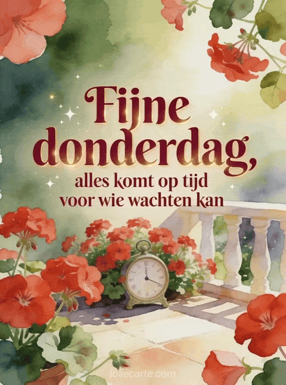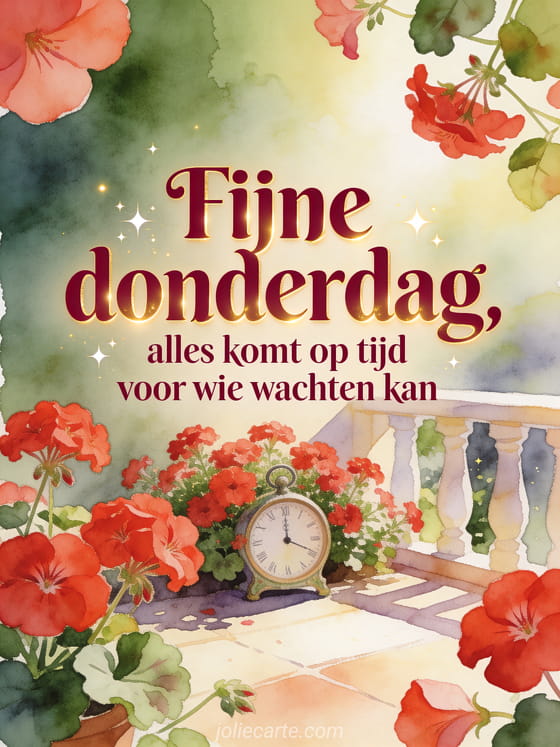 Deel een geduldige en vrolijke kaart voor fijne donderdag met een kleine tuinklok tussen rode geraniums op een zonnig terras. Bekijk ook een fijne donderdag zegen, een fijne dag donderdag gif of een fijne donderdag foto gif.