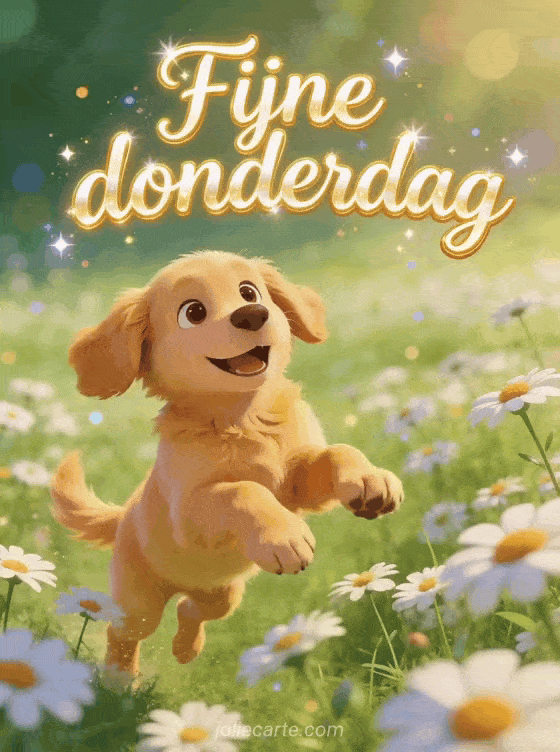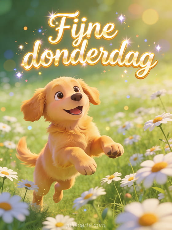 Stuur een vrolijke fijne donderdag groet met een speelse golden retriever puppy die door een veld margrieten springt in een zonnige sfeer. Ontdek ook fijne regenachtige donderdag gif, goedemorgen fijne donderdag sport afbeelding of kaarten om een fijne donderdag te wensen.