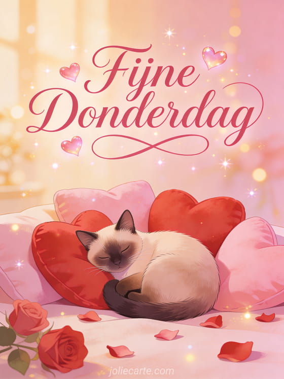 Verspreid liefde deze donderdag met deze tedere kaart met een lieve Siamese kat tussen hartvormige kussens en rozenblaadjes. Ontdek ook fijne koude donderdag of goedemorgen fijne dag van donderdag.