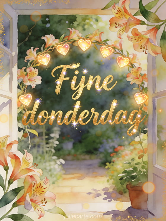 Deel een kaart voor fijne donderdag met gouden letters, lichtgevende hartjes en alstroemeria in een aquareltuin. Bekijk ook fijne donderdag zon afbeelding, fijne donderdag rood gif of fijne donderdag kusjes geanimeerde gif.