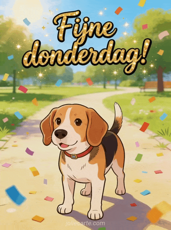 Stuur een vrolijke donderdaggroet met levendige letters, gouden glitters, een speelse beagle hond in een zonnig park en kleurrijke confetti-accenten voor een heldere kaartsfeer. Bekijk ook deze fijne donderdag kat gif, deze fijne donderdag virtuele kaart of deze fijne donderdag vrouw afbeeldingen.